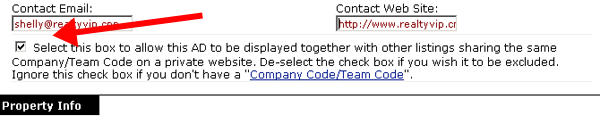 You (individual Advertiser) can decide AT ANY TIME if you want a particular property to be included in your brokerage office's list when you post a new ad or modify any of your existing ads. When you are at the data input page, select the appropriate checkbox if you want the property to be linked to the Team Code (see image below), otherwise just leave the box unchecked.