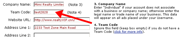 When you (individual) register as a new Advertiser you will be asked to enter a Team Code in the Registration Form. It is recommended that you fill in the box if you DO have a Team Code at the time you register as a new Advertiser, or at the time you modify your personal profile (see figure below).